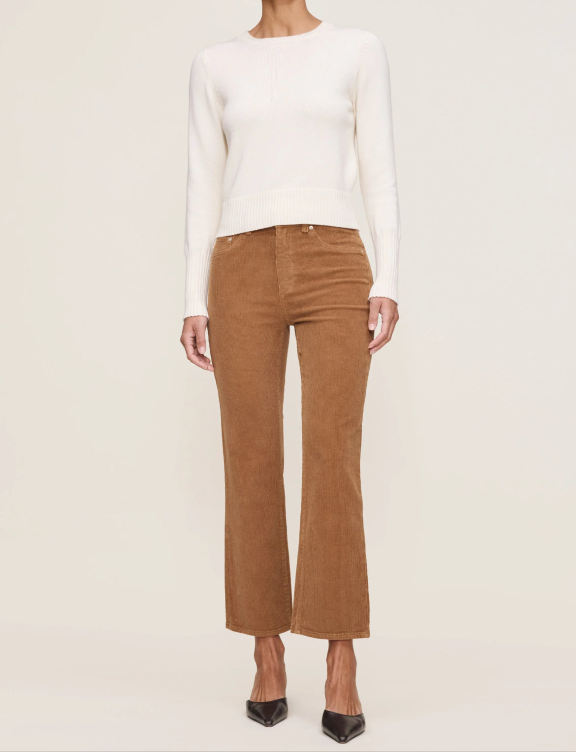 Teakwood is a golden brown corduroy with yellow undertones. It features gold hardware, tonal stitching, a clean hem and an en ecru back patch