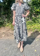 Introducing the Della Printed Maxi Dress. Such a classic color combination of black and white on a timeless button-up silhouette adorned with a floral accent. The optional waist tie creates a more tailored flattering silhouette. Such a versatile piece by Maude Vivante. Make a bold fashion statement in this exclusive dress.