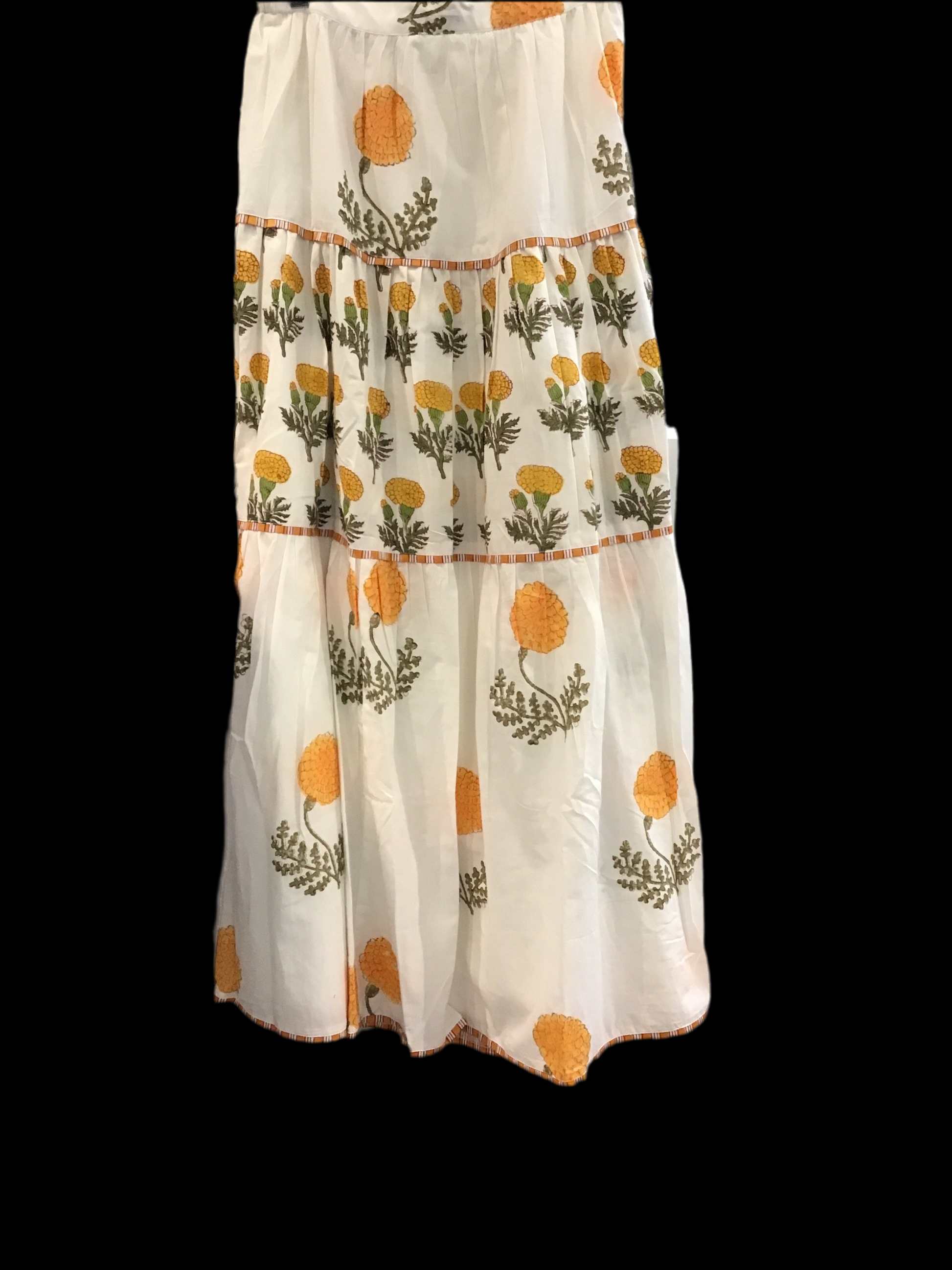 Long tiered maxi skirt with marigolds. Hand block printed