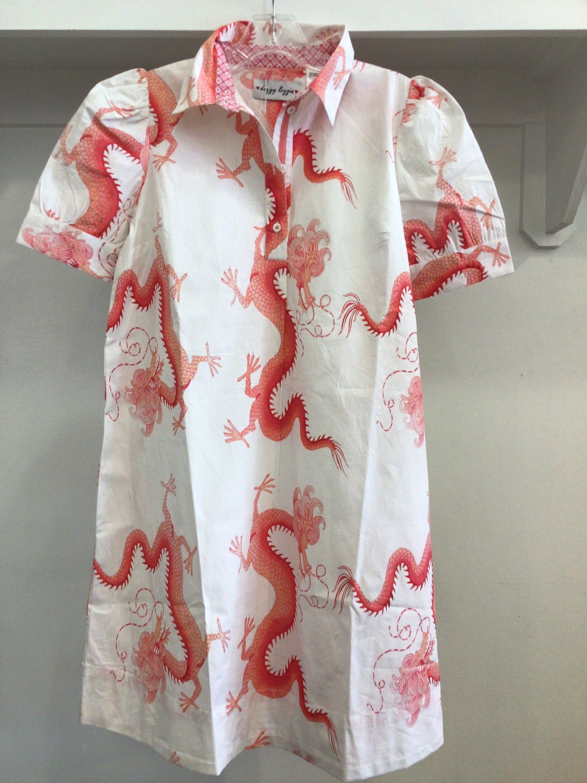 Left Bank Puff Sleeve Cotton Dress in Coral White Dragon Print by Dizzy Lizzie