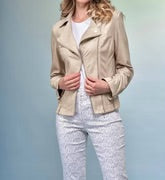A leather jacket so good, it works with just about any outfit. Meet the Insight Vegan Leather Jacket, a glamorous addition to your wardrobe with its stunning light gold hue. This women's jacket features long sleeves and a structured collar, offering a chic and modern design that stands out. Made from 90% polyester and 10% spandex, it includes a convenient zip closure and zipper details for an added edge. Care for this streetwear essential by washing delicately in cold water and hanging to dry; it's perfect for spring travel occasions