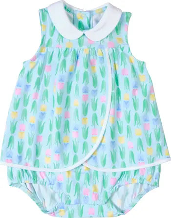 Soft, sweet, and full of spring color, this romper is crafted from pastel blue, yellow, pink, and green tulip print jersey knit with a hint of stretch for all-day comfort. A crisp white Peter Pan collar adds a timeless touch, while the petal-front crossover skirt with white binding creates a charming, dress-like silhouette. Gentle shirring at the yoke gives the skirt playful movement, and elastic leg openings ensure a comfortable fit. Finished with back and inseam snaps for easy changes, it’s perfect for warm spring playdates and picture-perfect days on the go.