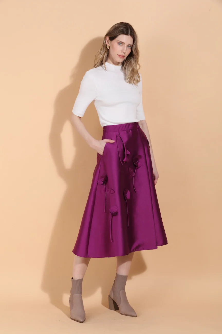 Wool Silk Blended Wrap Skirt with Flower Appliqué & Side Pockets in Purple by Jessie Liu